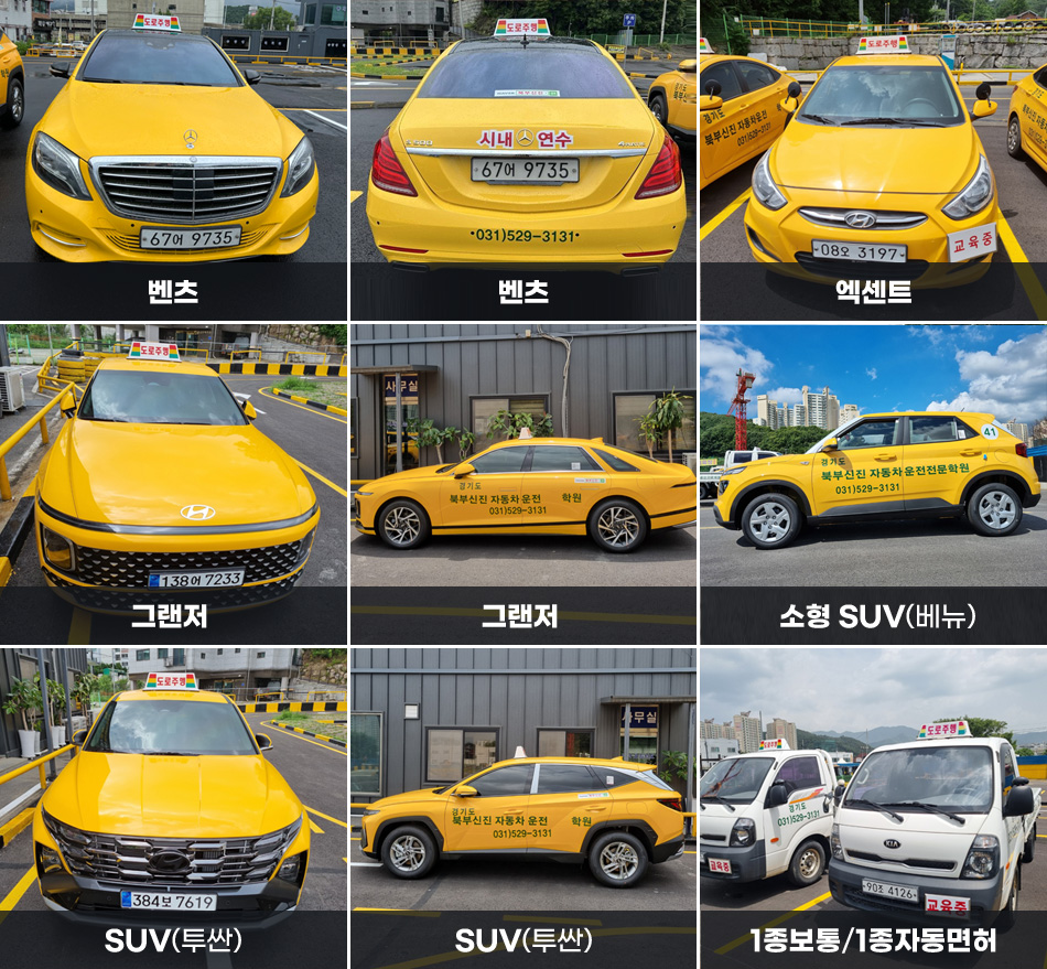 - 교습용 차량은 보험(교습용 종합보험)에 의무가입되어 있으므로 교육생 및 어떠한 사고에도 보험 혜택을 받으실수 있습니다.